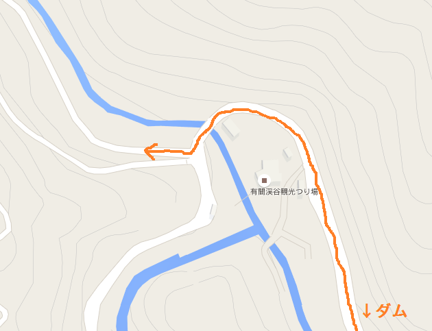 有間ダムの奥に行くと釣り場があるので、そこを右に曲がる。